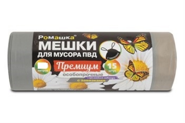 Пакет для мусора 50х60 30 л. / 15 шт. с завязками ПВД серый Р арт. ПЗВ301512С 35 мкм. (1/12) |