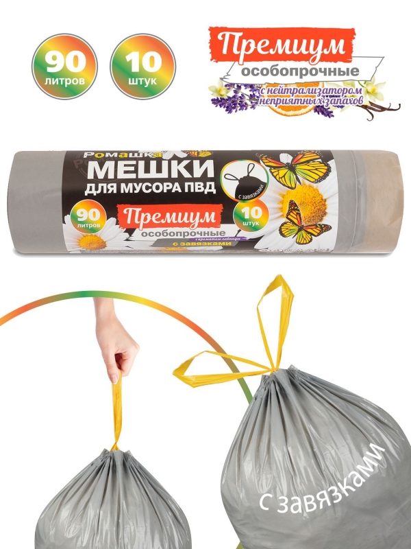 Пакет для мусора 90х110 180 л. / 10 шт. с завязками ПВД черный Р арт. ЗВС1801012Ч 45 мкм. (1/12) |